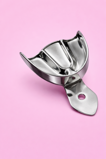 Cubeta fabricada en acero inoxidable con diseño perforado, destinada a la toma de impresiones dentales. Permite una mejor retención del material de impresión y una adaptación precisa en la cavidad oral. No desechable y apta para esterilización, ofreciendo resistencia, estabilidad y durabilidad en uso clínico.